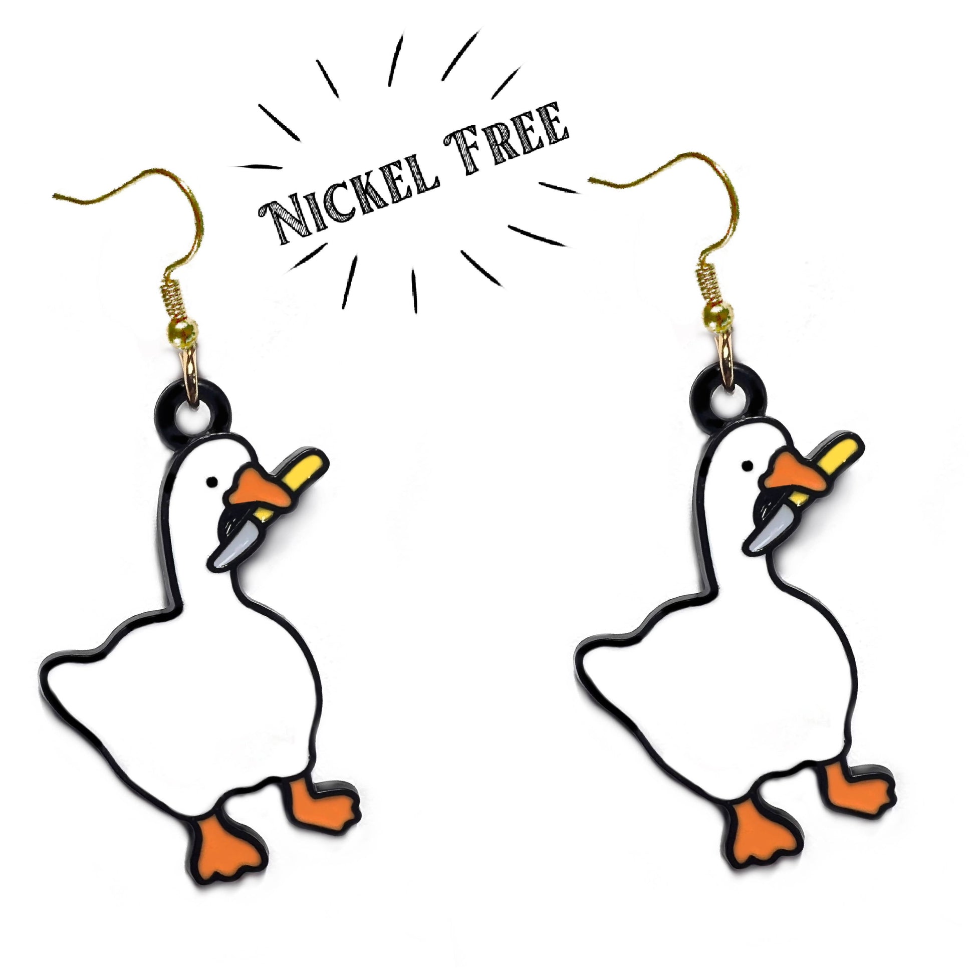 These delightful earrings are lightweight and measure an inch. They are detailed with a cute little goose with a knife in its mouth. Earrings are nickel and lead-free. Outlined in black, with yellow, white and orange enamel.