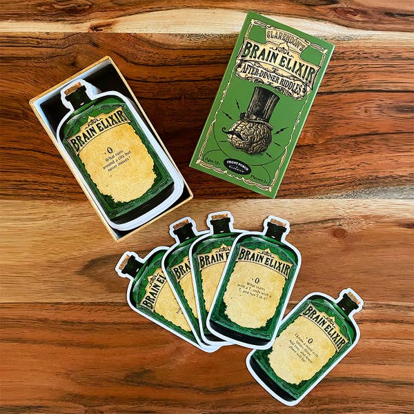 Claredon's Brain Elixir After-Dinner Riddles Vintage Card Game is a game of riddles that stimulates your brain. Draw a card from the deck, read the riddle, answer correctly and win the card. First player to collect 3 cards wins the game. Front Porch Classics is a distinctive line of expertly crafted games and puzzles that brings the best-known pastimes from around the world to your home. Beautifully and uniquely designed, these products make the perfect gift for any occasion. From coffee table games like State Fair Bingo and Shut-the-Box to the great classics like Rummikub, Front Porch Classics products are made to share and last for generations.