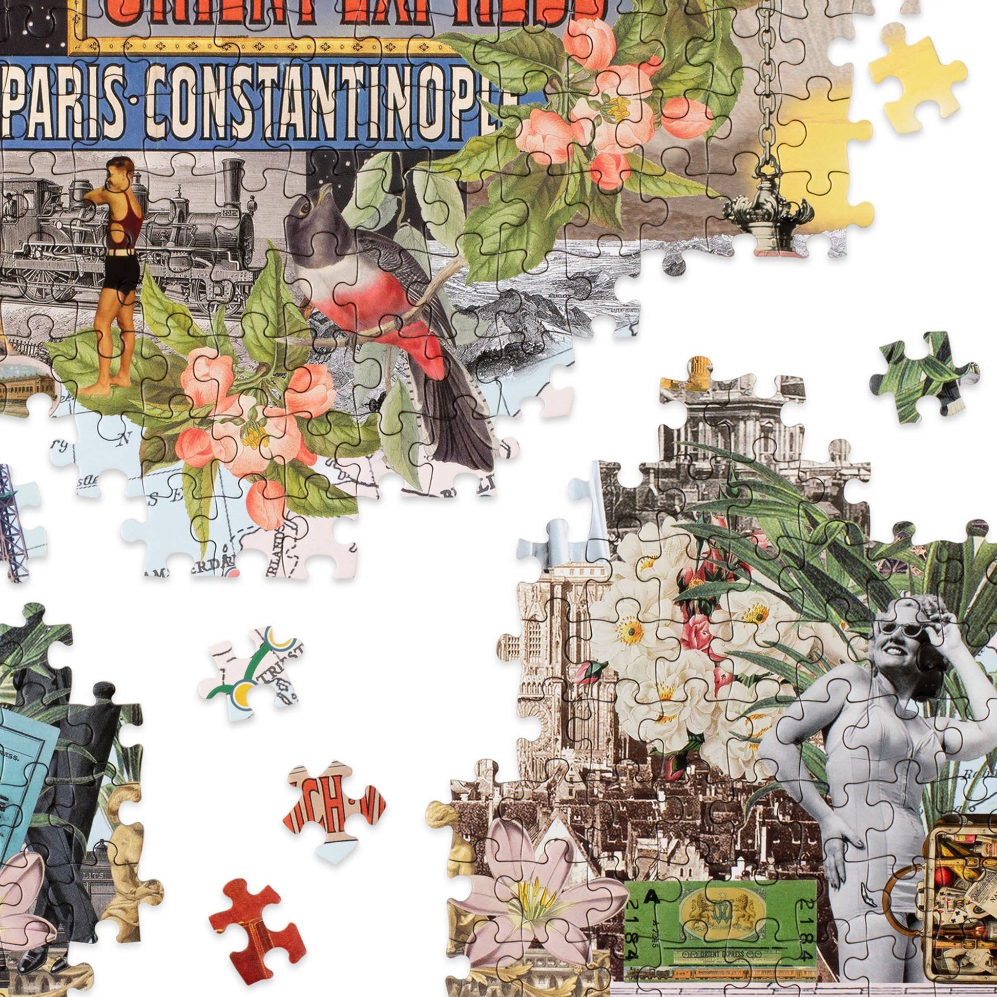 Orient Express is a 1000-piece nostalgic jigsaw puzzle journey through a dreamlike collage landscape of European railways, from celebrated collage artist Maria Rivans.