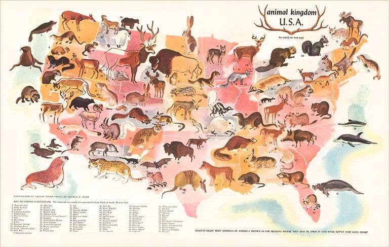 Postcard AN-300 Animal Kingdom, USA. This is a Postcard 3.5" x 5.5" featuring an image from our Animals collection titled Animal Kingdom, USA. Search keywords: map,species,landscape,horizontal,illustration,habitat