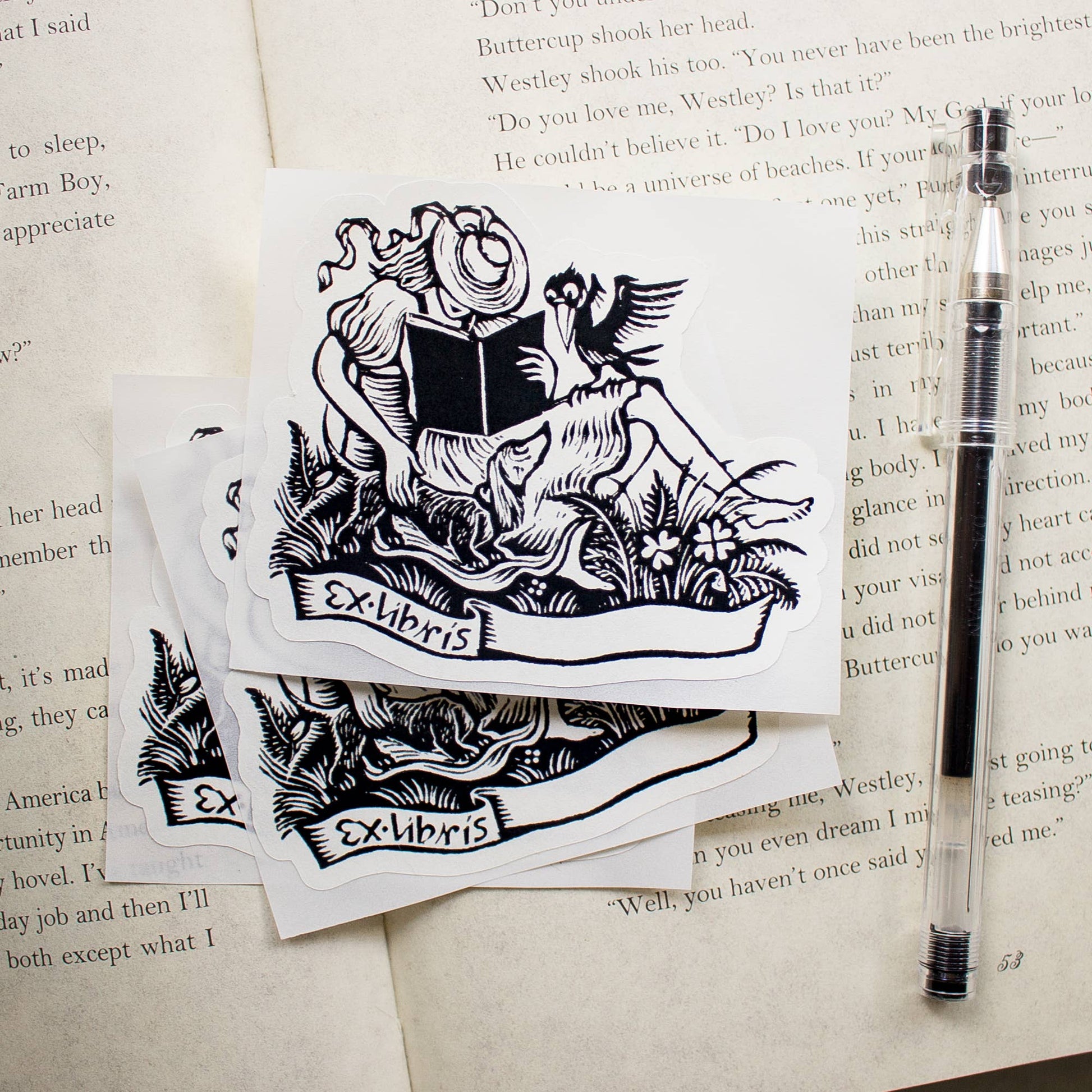 These reading girl bookplate stickers feature a young lady enjoying a good book with a crow and a dachshund.