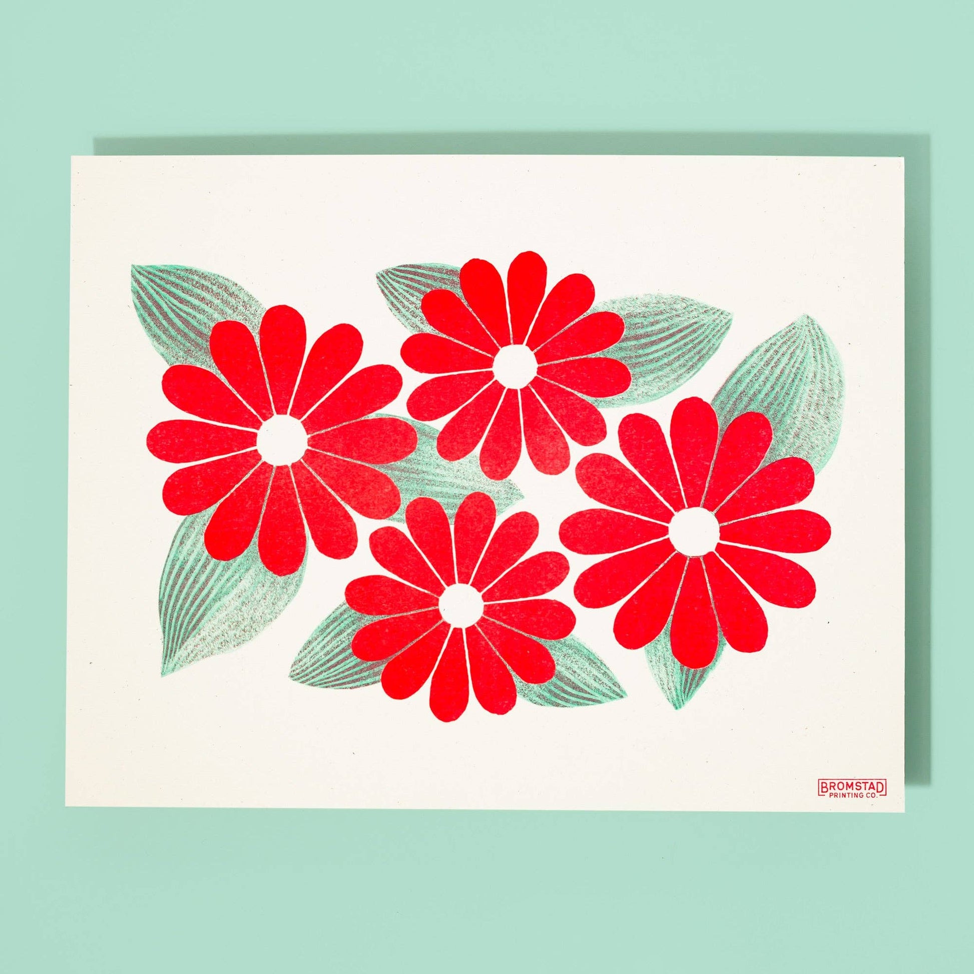 A charming group of red flowers are the perfect pop of art for any room. Risograph printed in bright red and seafoam.