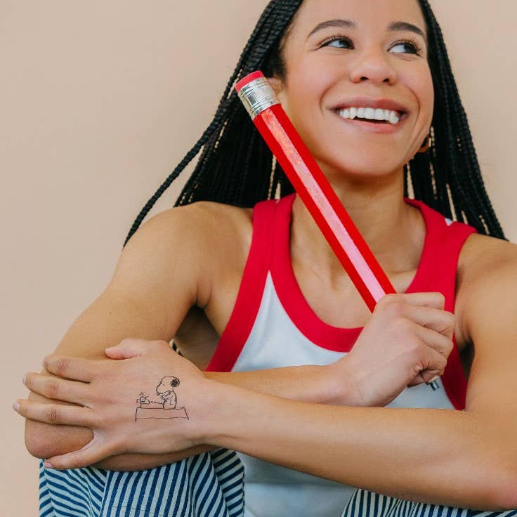 Snoopy Writer Tattoo Pair by artist PEANUTS®. Safety tested, vegan, cruelty free, and made in the US with domestic and imported materials. Tattly Pairs include two of each design packaged in a polybag and sealed with a branded topper that's ready to hang.