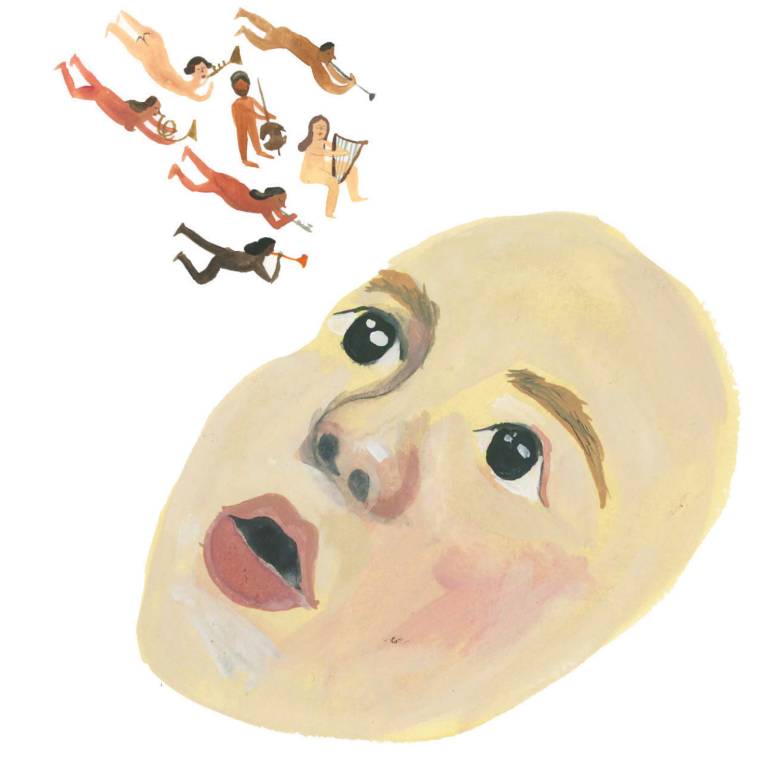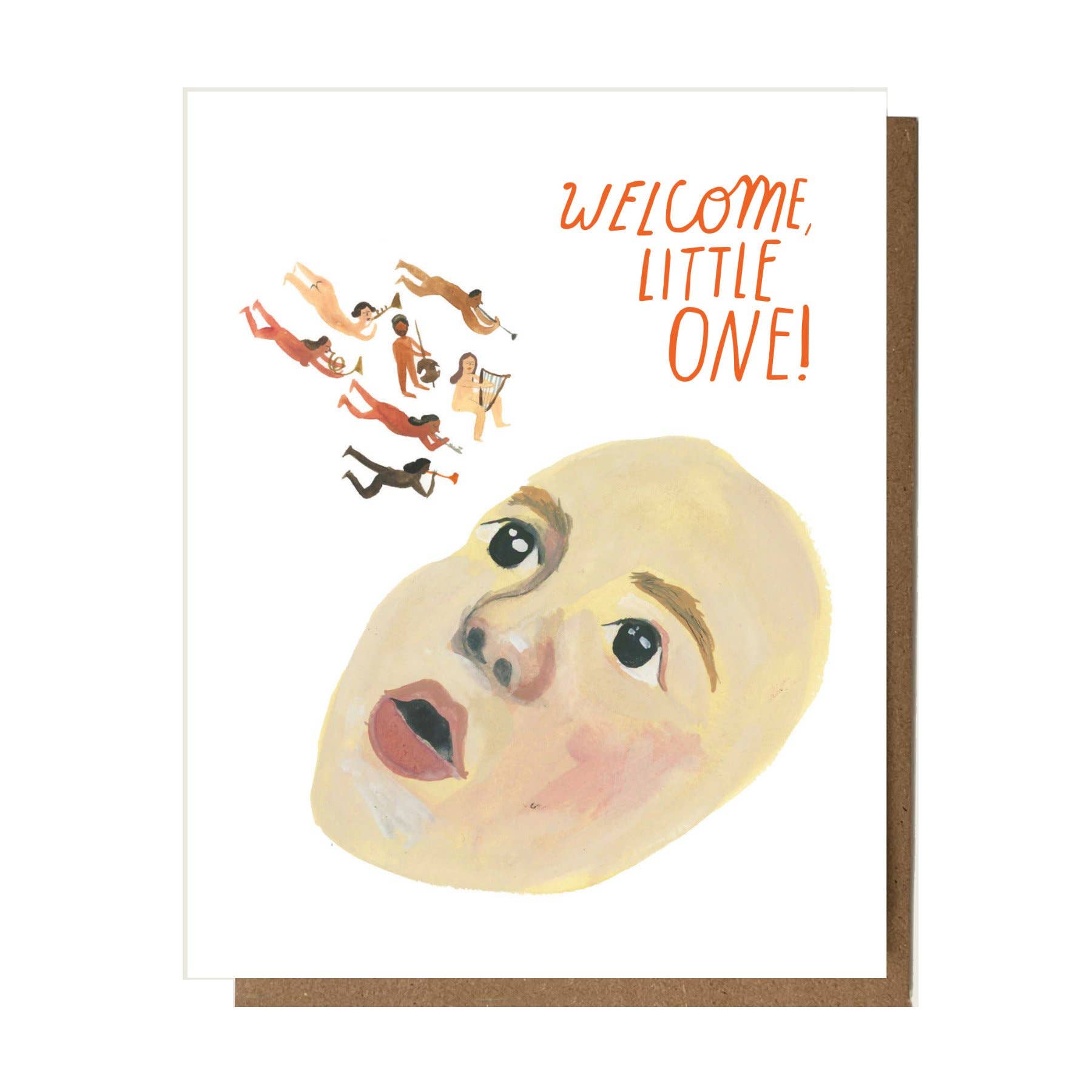 An eccentric multicolored greeting card featuring a large face looking up to multiple small nude angelic figures playing harps, trumpets, and lutes, text reads "Welcome, Little One!"